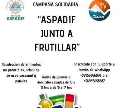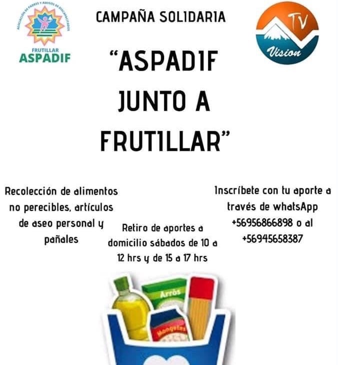 Nuestra última campaña realizada fue en plena pandemia año 2020, con la finalidad de ayudar a las familias con personas en situación de discapacidad quiénes, algunas quedaron sin ingresos y también no recibían los aportes que el gobierno estaba entregando. Fue por ésta causa que iniciamos la campaña de alimentos, entregando a 50 familias un aporte de una caja completa de víveres y otros elementos para el hogar; luego y gracias a la unión y colaboración de una organización "GRUPO DE AMIGOS FRUTILLAR" se logro mantener el aporte a 30 familias por tres meses.